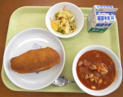 揚げパンに使われている「きな粉」は大豆を炒って、粉にしたものです。今日のメニューのポークビーンズにも大豆が入っています。 大豆は体を作ってくれるタンパク質が多く、「畑のお肉」とも言われています。ヘルシーな大豆で丈夫な体を作りましょう。