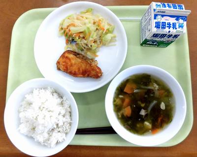 今日の給食は、麦ご飯、魚かば焼き風、レモン和え、アオサ汁でした。