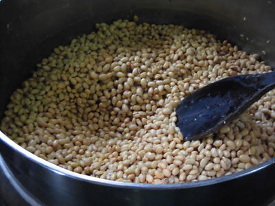 機械に入れてなじませます。ぱさぱさにならないように大豆の煮汁も入れます。