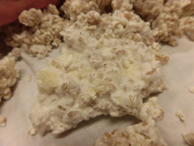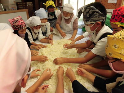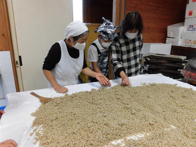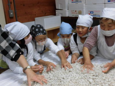 麹はとってもあま~いにおいがするそうです。甘酒のにおいがして、温かいそうですよ。みんなでほぐしました。