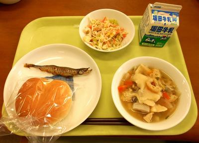 今日の給食は、米粉パン、すいとん、ごマネーズサラダ、ししゃもでした。