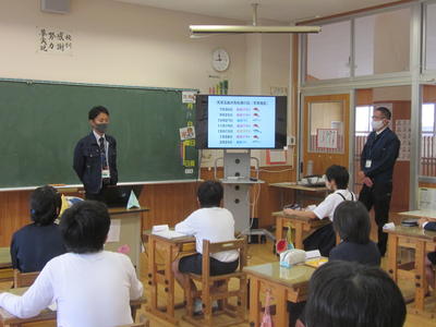 そして次は、お魚給食についての話題です。昨日は「お魚給食」でした。天草で養殖された立派な鯛の切り身で、とてもおいしかったです。水産振興課から、5年生にお話をしに来ていただきました。