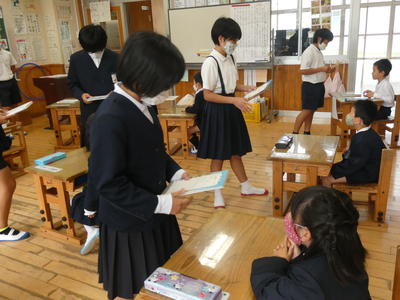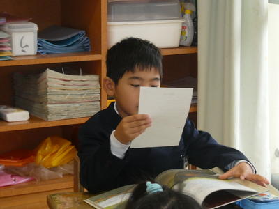 今月は読書月間です。ペアの学年と読書メールを交換します。高学年が低学年のために本を選んで紹介カードに書き低学年に届けます。低学年は本を読んで感想を書きます。今日は6年生が1年生の教室に本とカードを届けてくれました。