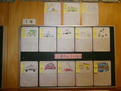 1年生が「じどう車くらべ」を学習して、「しどう車ずかん」を作りました。そして読み合って交流しました。
