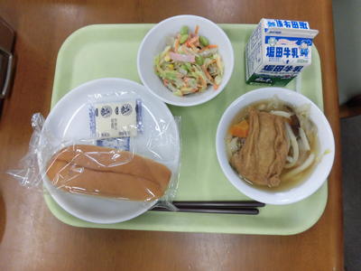 今日の給食は、パン、牛乳、きつねうどん、ゴボウサラダ、ソフトチーズでした。