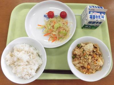 今日の給食は、麦ご飯、炒り豆腐、青じそドレッシングあえ、ミニトマトでした。