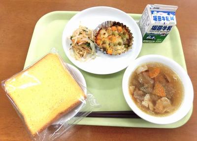 今日の給食は、人参パン、ころころカップ焼き、冬瓜スープ、もやしナムルでした。
