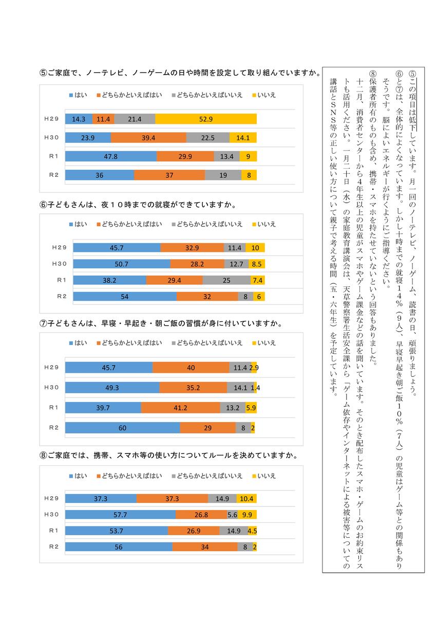 12月末には、天草町保・小・中連携カリキュラム(はつらつ天草っ子)保護者アンケートにご協力いただきありがとうございます。以下は結果とその結果の考察です。H29年からR2年までの4年間の推移も分かります。