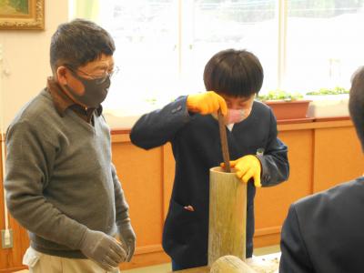 6年生。卒業制作!第1回目!伊野修一先生にお世話になり、竹明かりを作ります。今日は竹の皮はぎをしました。われた茶碗のかけらで鰹節をけずるように削っていきました。とても楽しそうな子どもたちでした。