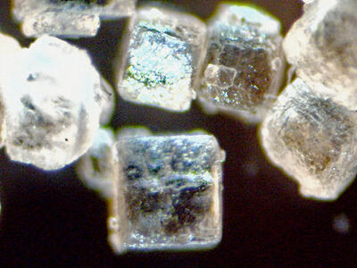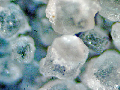 これは食塩です。立方体のきれいな結晶が集まっています。角があるので食塩はザラザラした手触りがしますね。いろんな物を磨くのに食塩を使うのは、そのためではないでしょうか。では次は何の顕微鏡写真でしょうか?