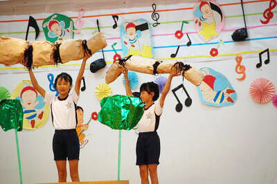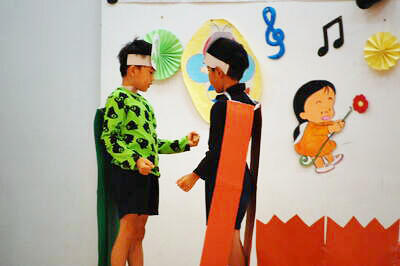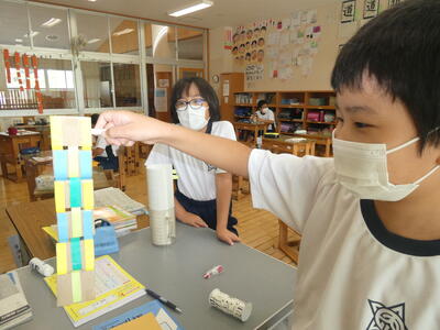 続いてまたまた2年生。新聞紙でなにやら作っています。でっかいのができていますね。