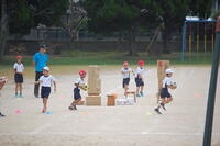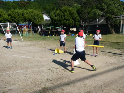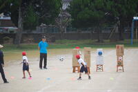 1・2年生の合同体育では、段ボールを積み重ねた的に子供達がボールを当て、倒すゲームをしました。的が倒れると子供達から歓声が上がり、とても楽しそうでした。