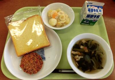 今日の給食のメニューは、ひじきご飯、相性汁、おかか和え、玉子焼きです。