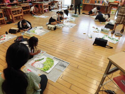 本日も伊野博子先生においで頂き、1・3・4年 生の描画指導をして頂きました。1年生は大胆な構図でいきいきとした色づかいで楽しみながら取り組んでいました。
