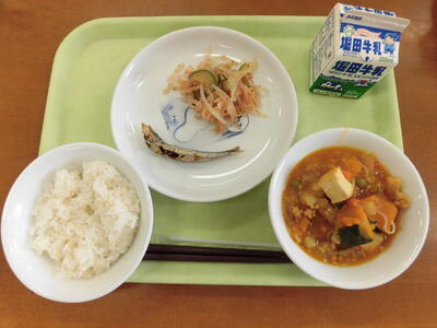 今日の給食のメニューは、麦ご飯、かぼちゃそぼろ煮、梅おかか和え、めざしです。