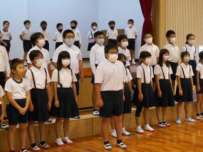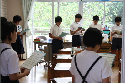 「地球(ほし)とタンポポ」に続く第2弾。仁田直美さんが作詞・作曲され、校長先生が編曲された「SAKURA」という曲を6年生が練習しました。修学旅行の平和記念公園での平和集会で歌います。今日も6年生の素晴らしい歌声が教室に響いていました。