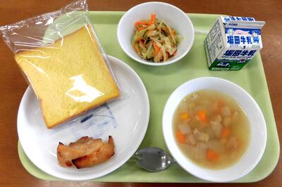 今日の給食のメニューは、ココアパン、かぼちゃサラダ、ちくわカレー煮、ワンタンスープです。
