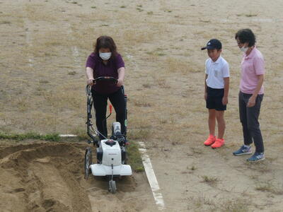 3・4年生はミニハードルのおかれたコースを一生懸命走り、タイムを測定しました。体育の授業が終わって、「先生、この前よりタイムが縮まりました。」とうれしそうに話してくれる人もいました。