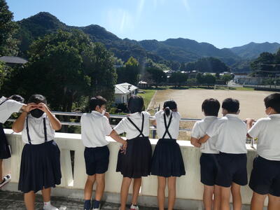 本日から明日まで6年生は修学旅行です。今日は、朝7時5分に大江桑鶴をバスが出発し、7時15分に高浜で5人の児童を乗せていきました。検温や手指の消毒もガイドさんにして頂きました。ゆうべ寝られなくてちょっと眠そうな人もいましたが、全員元気にバスに乗り込み、発車しました。天候にも恵まれたので、楽しく有意義な2日間になりますように