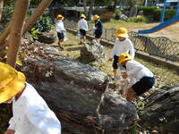 学校のコイコイ池や1年生教室前の庭園にクスノキが生えています。クスノキの葉をちぎって匂いを嗅ぐとツンとする樟脳の香りがします。クスノキは独特な芳香を持つことから「臭し(くすし)木」がその語源です。また、クスノキの葉や煙は防虫剤や鎮痛剤として用いられ、「薬の木」を語源とする説もあります。クスノキ材は防虫効能から家具や仏像などにも広く使われてきました。天草にもかつてはクスノキから樟脳を抽出する工場がありました。