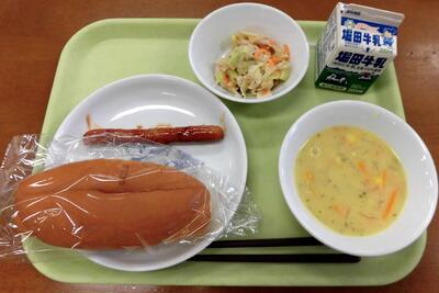 今日の給食のメニューは、セルフドッグ(ウインナー)、ツナとレンコンのサラダ、コーンスープです。