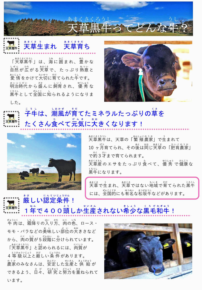 今日は、高級食材「天草黒牛」が給食に出ました。以下は「天草黒牛」に関する天草市産業政策課天草ブランド推進係作成の資料です。