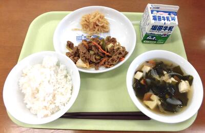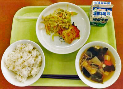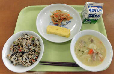 今日の給食のメニューは、ひじきご飯、相性汁、おかか和え、玉子焼きです。