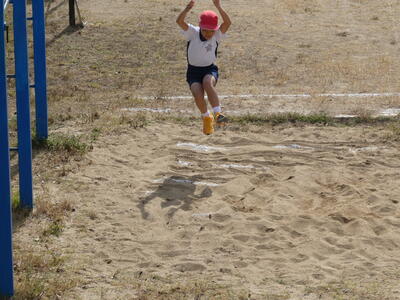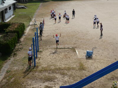 白線の5本目を目指して跳ぼう。高いジャンプだ。手もいいね。