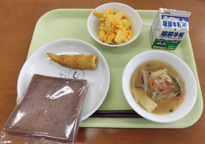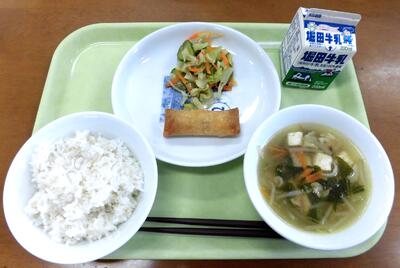 今日の給食のメニューは、麦ご飯、スルメあえ、中華スープ、春巻きです。