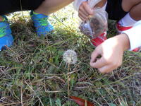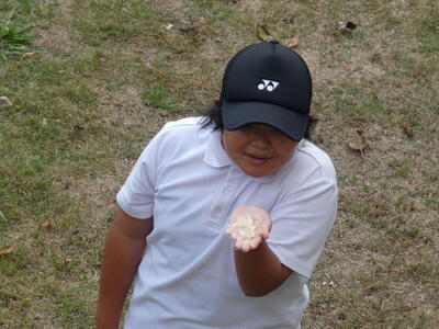 こいこい池のがまの穂を飛ばして遊ぶ5年生
