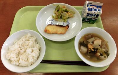今日の給食のメニューは、麦ご飯、鶏の味噌マヨ焼き、ごま和え、吸い物です。