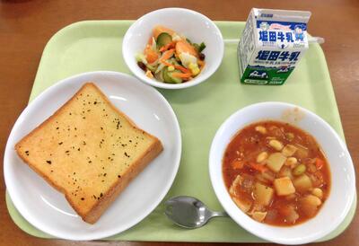 今日の給食のメニューは、ガーリックトースト、チキンビーンズ、柿サラダです。
