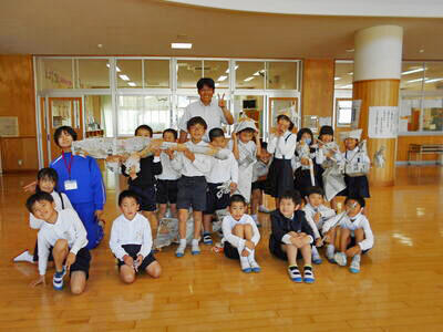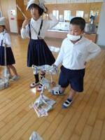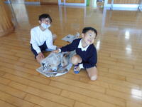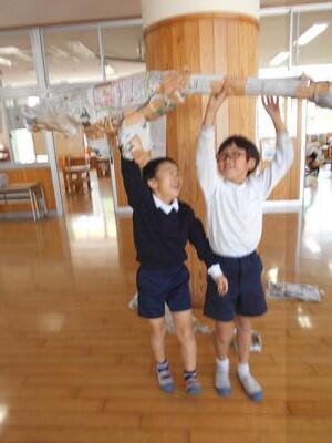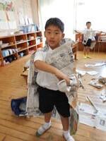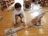 続いてまたまた2年生。新聞紙でなにやら作っています。でっかいのができていますね。
