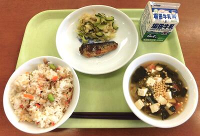 今日の給食のメニューは、きのこご飯、あられすまし汁、いわし梅煮、切り干し酢の物です。