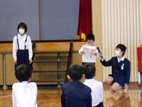 昼休みは運営委員会主催の全校縦割り班遊びをしました。1~3班は体育館で風船紙コップ、5~6班は尻文字伝言ゲームをしました。