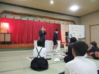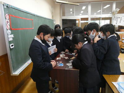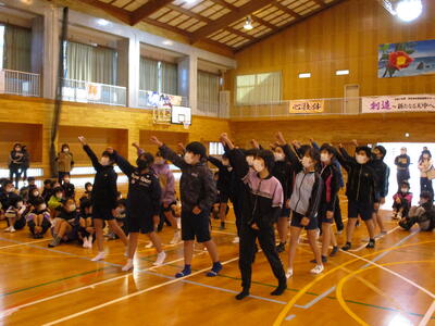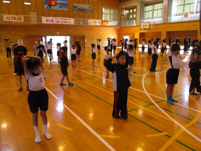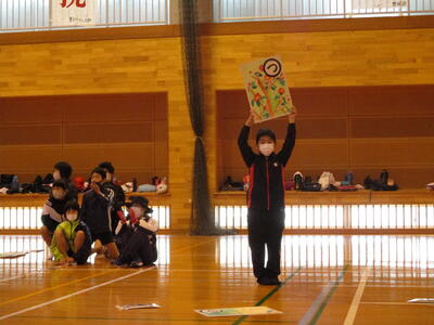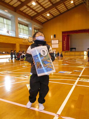と、その前に、まずは開会式の前の体ほぐしタイムから。全校児童でふるさとカルタをしました。