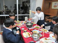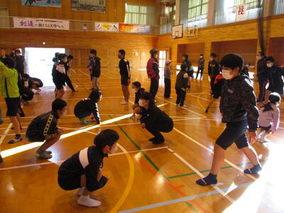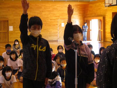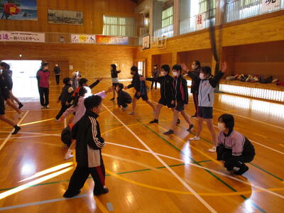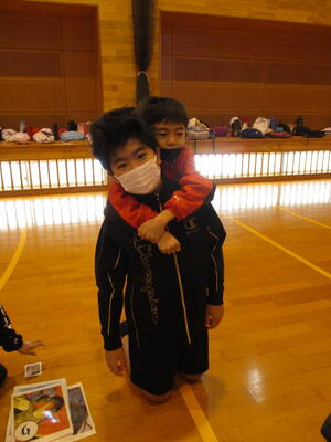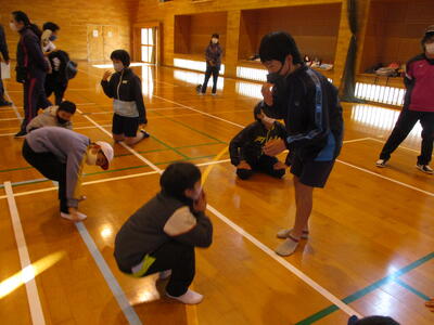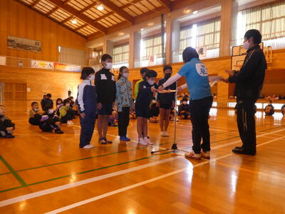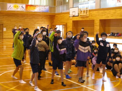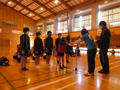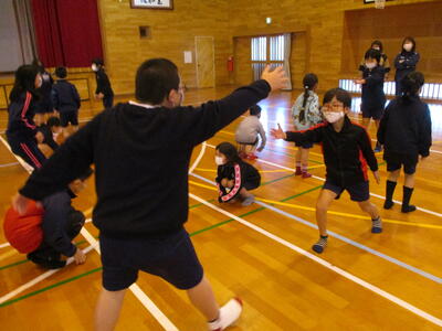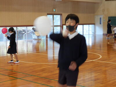 昼休みは運営委員会主催の全校縦割り班遊びをしました。1~3班は体育館で風船紙コップ、5~6班は尻文字伝言ゲームをしました。