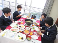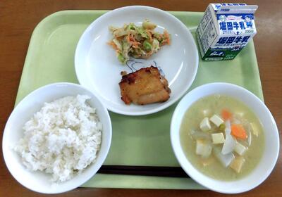 今日の給食のメニューは、麦ご飯、鶏山椒焼き、里芋味噌汁、ツナマヨ和えです。