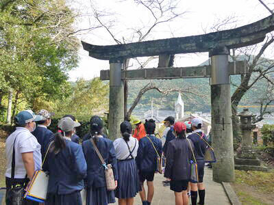 﨑津諏訪神社に移動しました。鳥居の向こうに教会が見えています。