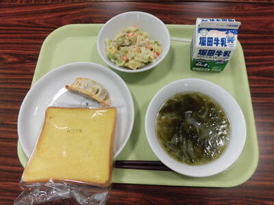 今日の給食のメニューは、人参パン、さつまいもサラダ、餃子、あおさスープです。