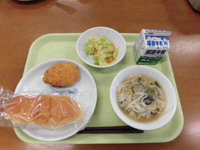 今日の給食のメニューは、ミルクパン、コロッケ、添え野菜、平麺スープです。