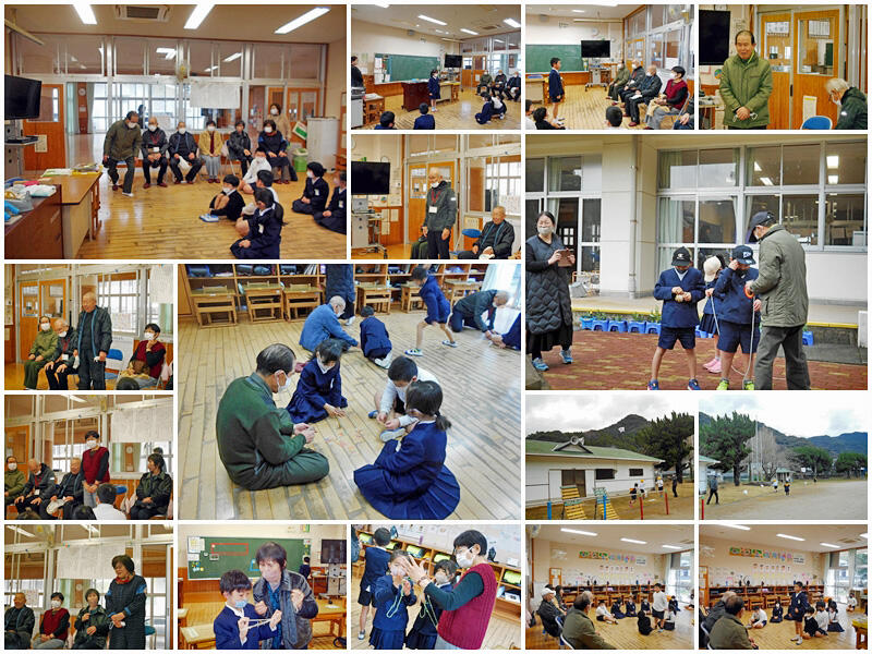 下田南老人会の方々においで頂き、1・2年生が昔遊びにチャレンジしました。メンコ・あやとり・こままわし・たこあげなどの伝承遊びを今の子供たちはしなくなってきているので、老人会の方々に教えてもらいながら楽しく過ごすことができました。下田南老人会の皆様、寒い中でしたが、熱心にご指導頂き、ありがとうございました。