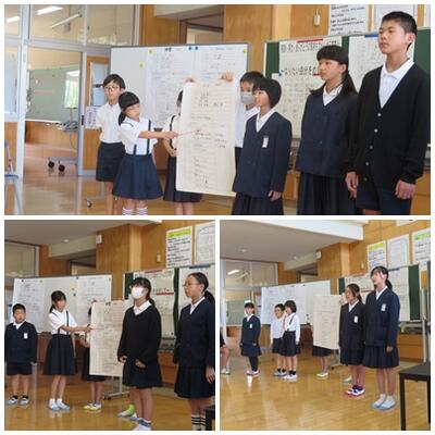 本年度のテーマは「笑顔 努力 ありがとうの気持ちでがんばる天草小~なりたい自分をめざして~」です。今日は給食委員会、保健環境委員会、放送委員会、図書委員会、体育委員会、運営委員会の六つの委員会が目標と年間活動計画を発表しました。その後、質問や意見で交流し、最後に教頭先生から「①態度②発表の仕方と内容③質問や意見のやりとりがすばらしかっ た」と講評がありました。