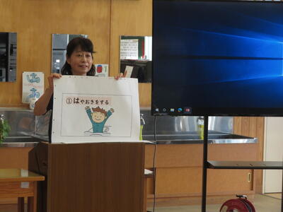 始業式では、学校長より、学習面・生活面等について話がありました。生活面では生活指導担当から、保健面について養護教諭から話がありました。それではみなさん、「たのしく えがおいっぱいの にがっきに」しましょう。
