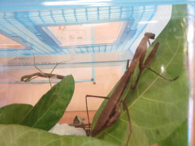 低学年は、虫取りが大好きです。2年生の教室には大きなかまきり「オオカマキリ」が。