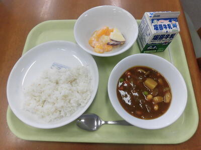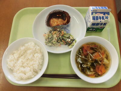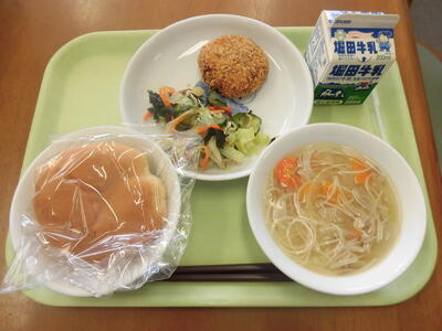 今日の献立は、『まるパン、ビーフン汁、コロッケ、海藻サラダ』でした。中はホクホク、外はサクサクのコロッケが美味しかったです。さっぱりとした味付けの海藻サラダ、ビーフンがはいったスープがパンとの相性がよく美味しかったです。明日は、みんな大好きなカレー・・・、楽しみです。