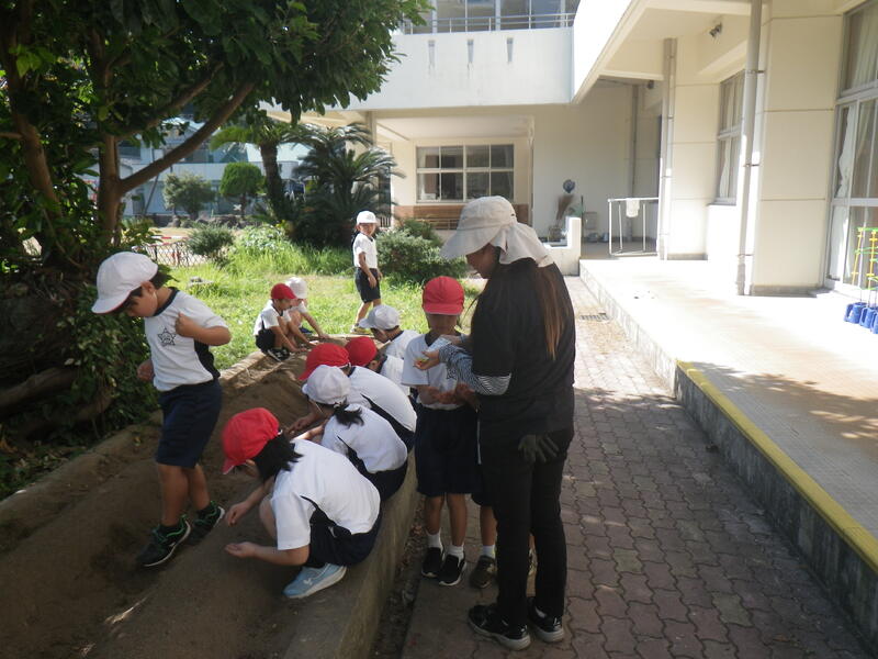 宮崎先生にもお手伝いしていただき、植え終わりました。宮崎先生に「ありがとうございました」とお礼を言いました。