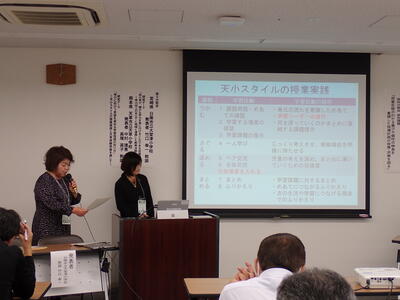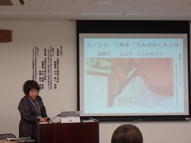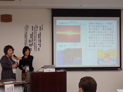 昨日くまもと森都心プラザ(熊本市)で標記大会が行われ、「学びに向かう意欲を高める学習指導の在り方~天小スタイルの授業実践と天草体験学習を通して~」という題で本校の実践を発表してきました。発表内容は、開校当時から子どもたちの力を高めようと、天草小の歴代の先生方が考えられ積み重なった授業について、そして福連木、下田、高浜、大江と各地域の皆様にお世話になりながら、地域の宝を学習している天草体験学習についてです。分散会の最後にまとめに、宮崎県の指導主事の先生から、「単元の言語活動に向かうための学習課題がはっきりしていること。根拠をもとに教材文を読み取り、交流の質も深まっていること。学習リーダーは、繰り返し経験を積むことで児童は鍛えられ、将来の活躍につながること。天草体験学習はカリキュラムを整理したことで、目的が明確になっていること。統合前の校区を大切にして体験学習を進めていること。」などと本校の日々の努力を褒めていただきました。