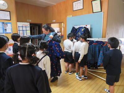 今週末は福連木の子守唄&童謡まつりです。今年もかすりの着物を着てステージに立ちます。昼休みはそのための衣装合わせをしました。