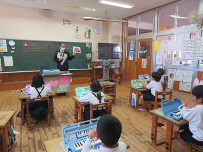 水田楽器の水田さんから鍵盤ハーモニカの使い方や演奏の仕方を教わりました。バスのクラクションや救急車の音などを鳴らしながら、楽しく学ぶことができました。